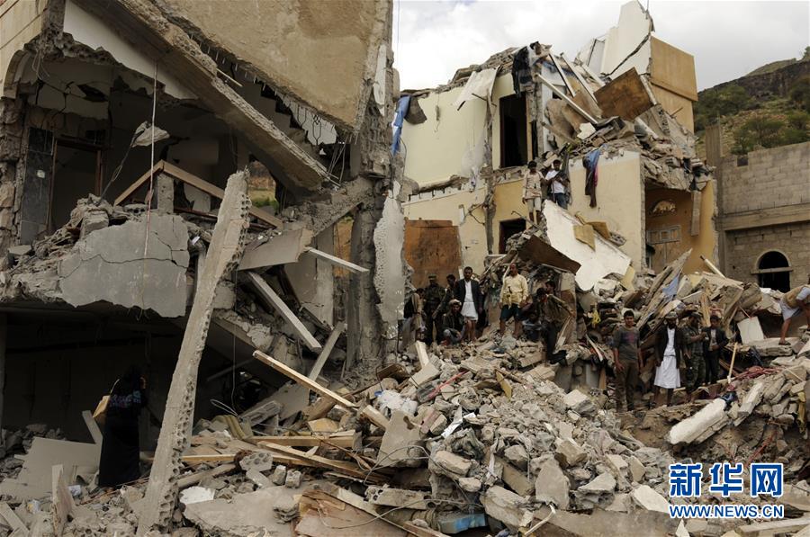 8月25日,在也門首都薩那,人們聚集在空襲炸毀的房屋瓦礫周圍。也門救援人員25日説,沙特阿拉伯領導的多國聯軍當天清晨對薩那實施空襲,擊中一處民宅,造成至少16人死亡。 新華社發(穆罕默德 攝)