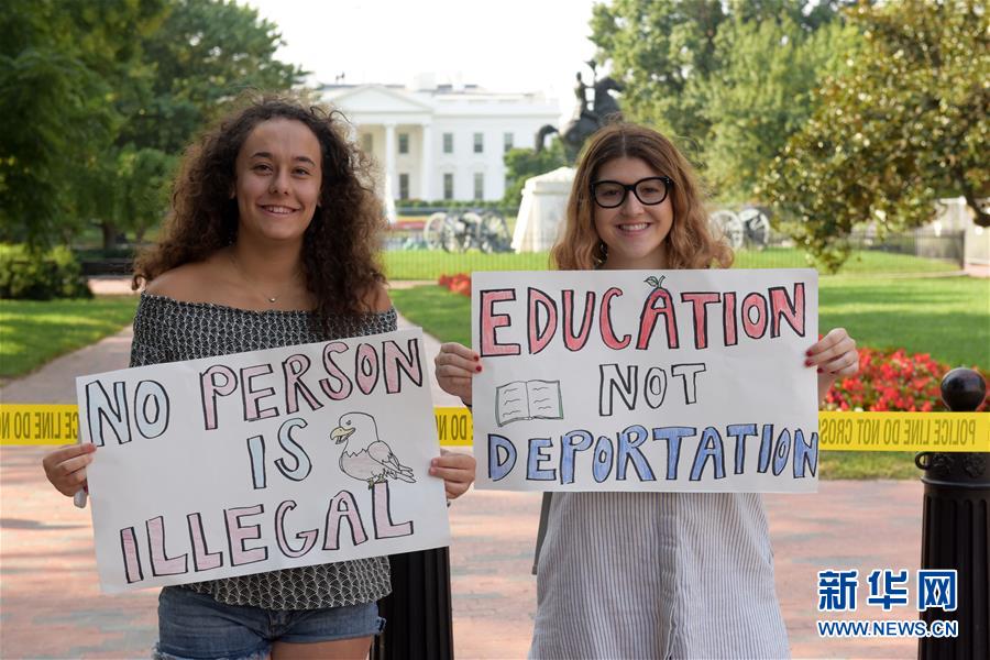 9月5日,兩名女孩在美國華盛頓白宮附近參加集會,抗議總統特朗普廢除“童年抵美者暫緩遣返”計劃。美國總統特朗普5日下令廢除前任政府通過行政令推行的“童年抵美者暫緩遣返”計劃。廢除令暫緩6個月執行,以便國會尋求替代政策。“童年抵美者暫緩遣返”計劃2012年由時任美國總統奧巴馬簽署實施,此舉使年幼時被父母帶入美國的青少年非法移民可以免于被遣返,並能合法獲得工作。這部分人被稱為“夢想者”,據統計約有80萬人,大部分來自墨西哥和其他拉丁美洲國家。新華社記者 殷博古 攝