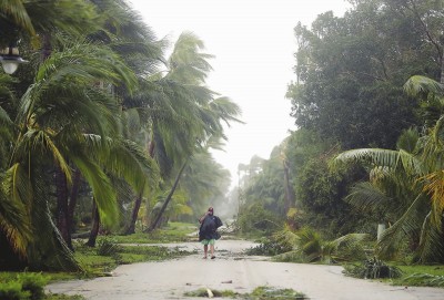 資料圖: 9月10日,在美國佛羅裏達州那不勒斯,一名行人走過遭颶風襲擊後棕櫚樹七倒八歪的街道。新華社發