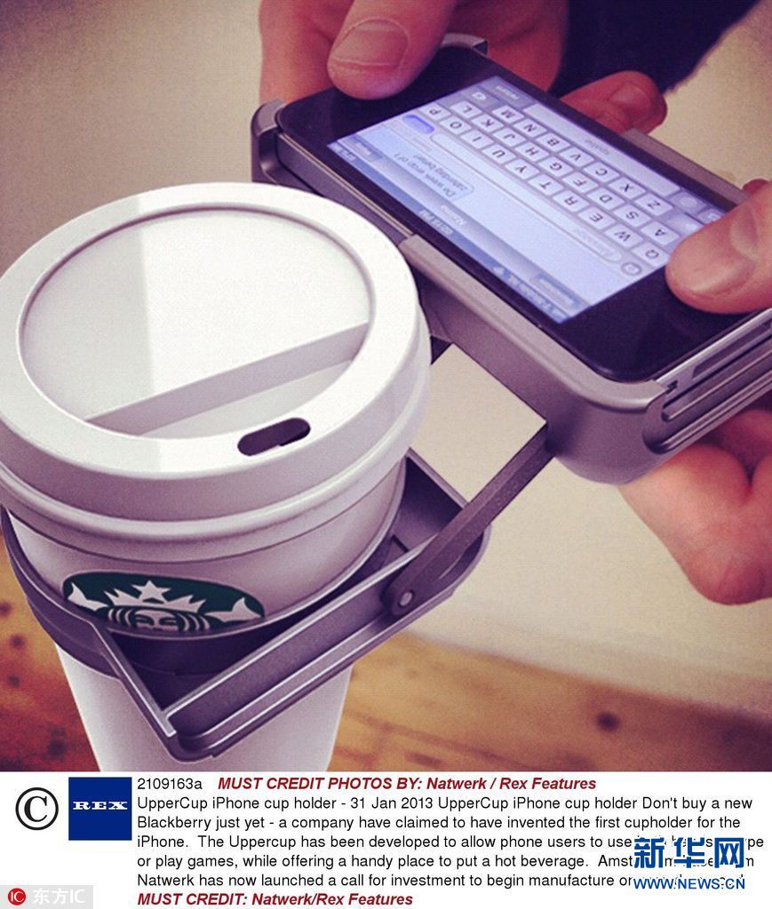 當地時間2013年1月31日,先別著急買新出的黑莓手機,荷蘭一家公司宣布推出了一款iPhone杯架,讓手機族可以用雙手打字或玩遊戲,而飲料也不會灑。目前,荷蘭設計公司Natwerk還在為他們的這一發明拉投資,希望能籌到2萬5千美元,這樣他們就能投入生産,以35美元的單價出售。(圖片來源: 東方IC)