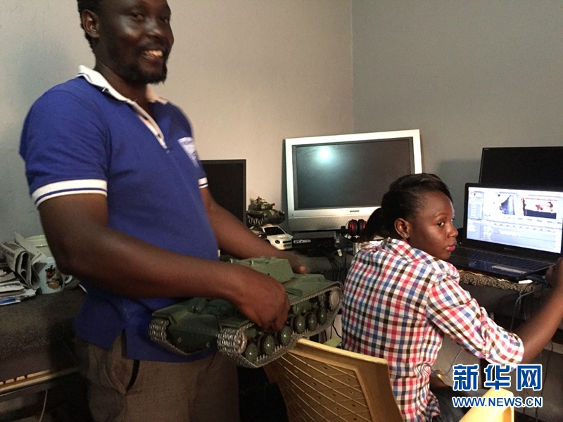 伊薩克(左)在剪輯室展示“坦克”道具。 新華網記者張改萍攝