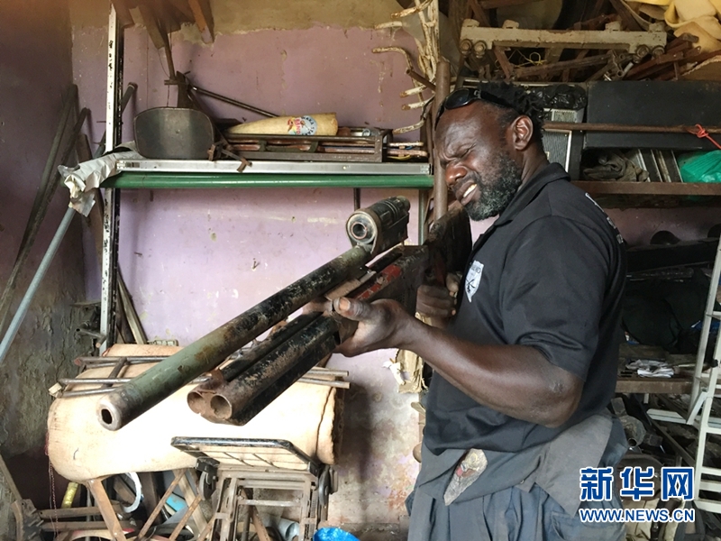 道具室裏存放的道具、槍械等都是手工制造,圖為演員展示槍械道具。 新華網記者張改萍攝