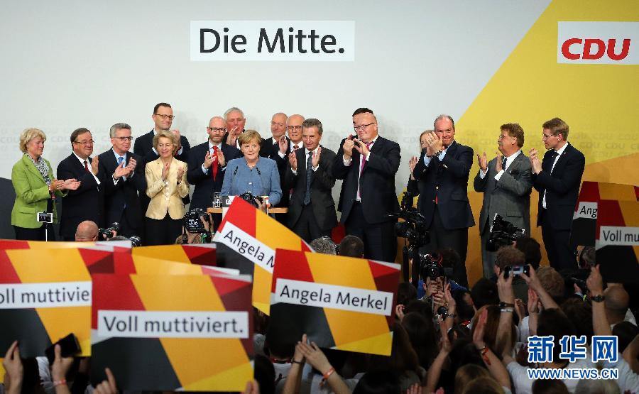 9月24日,在德國柏林的基督教民主聯盟(基民盟)總部,德國總理默克爾在初步出口民調顯示領先後接受祝賀。根據德國媒體24日晚公布的多家機構的初步計票結果,德國總理默克爾領導的聯盟黨在當天舉行的德國聯邦議院選舉中獲得最多選票,領先其他各黨。新華社記者羅歡歡攝