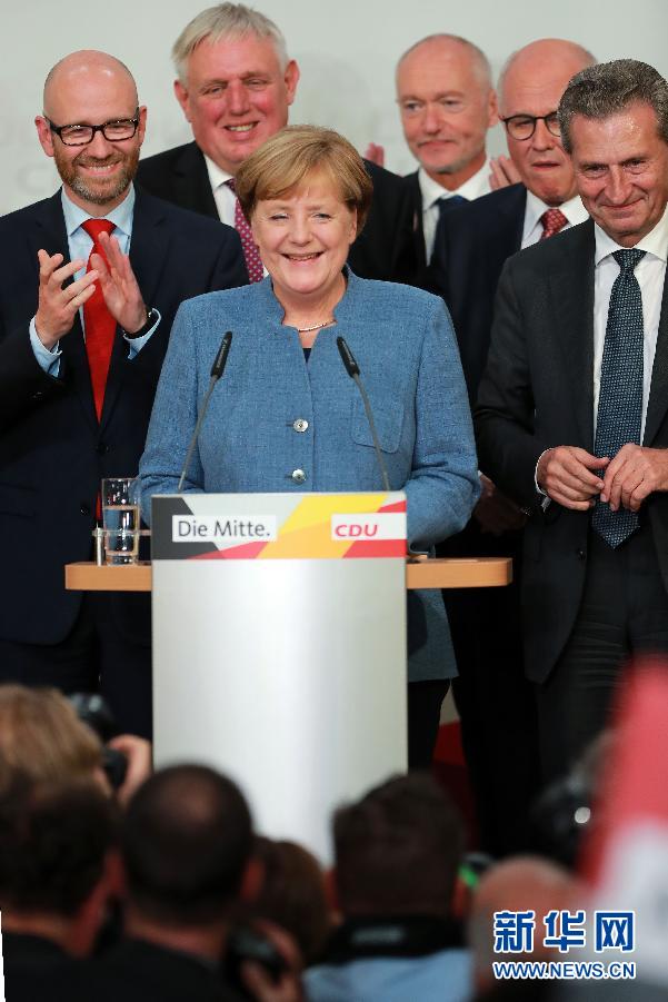 9月24日,在德國柏林的基督教民主聯盟(基民盟)總部,德國總理默克爾(中)在初步出口民調顯示領先後接受祝賀。根據德國媒體24日晚公布的多家機構的初步計票結果,德國總理默克爾領導的聯盟黨在當天舉行的德國聯邦議院選舉中獲得最多選票,領先其他各黨。新華社記者羅歡歡攝