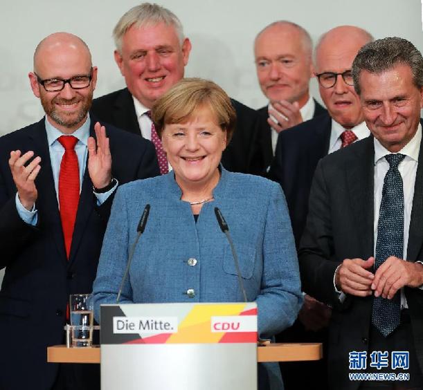 德國總理默克爾(中)在初步出口民調顯示領先後接受祝賀。新華社記者 羅歡歡 攝