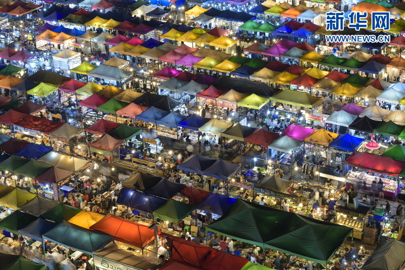 2017年11月2日訊(具體拍攝時間不詳),泰國曼谷,色彩鮮艷的帳篷緊密排列讓夜市看起來像巨大的棉毯。這個露天的市場從下午5點到淩晨1點營業,商品琳瑯滿目,從食物、衣服到古玩和收藏品。市場有1200多個攤位,色彩鮮艷的防水布從攤位內部被照亮,在夜晚異常耀眼。攝影師Peter Stewart造訪了曼谷Rod Fai夜市,在多層停車場的頂層拍到了這樣的夜市全景畫面。(圖片來源:視覺中國)