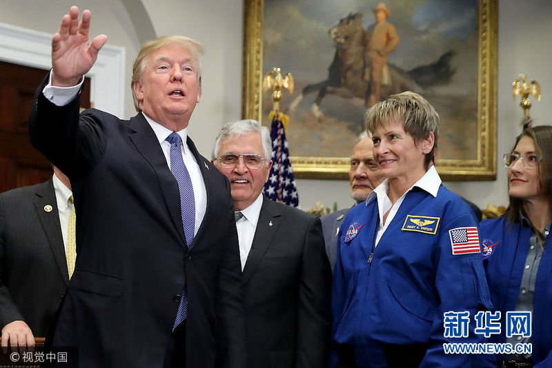 當地時間2017年12月11日,美國華盛頓,美國總統特朗普指示美國國家航空航天局(NASA)讓美國宇航員重返月球,並最終前往火星。NASA的任務從地球研究轉移到探索火星的長遠計劃。(圖片來源:視覺中國)