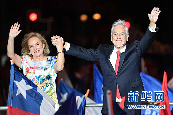 12月17日,在智利首都聖地亞哥,當選總統皮涅拉(右)向人們揮手致意。新華社發(豪爾赫·比列加斯攝)