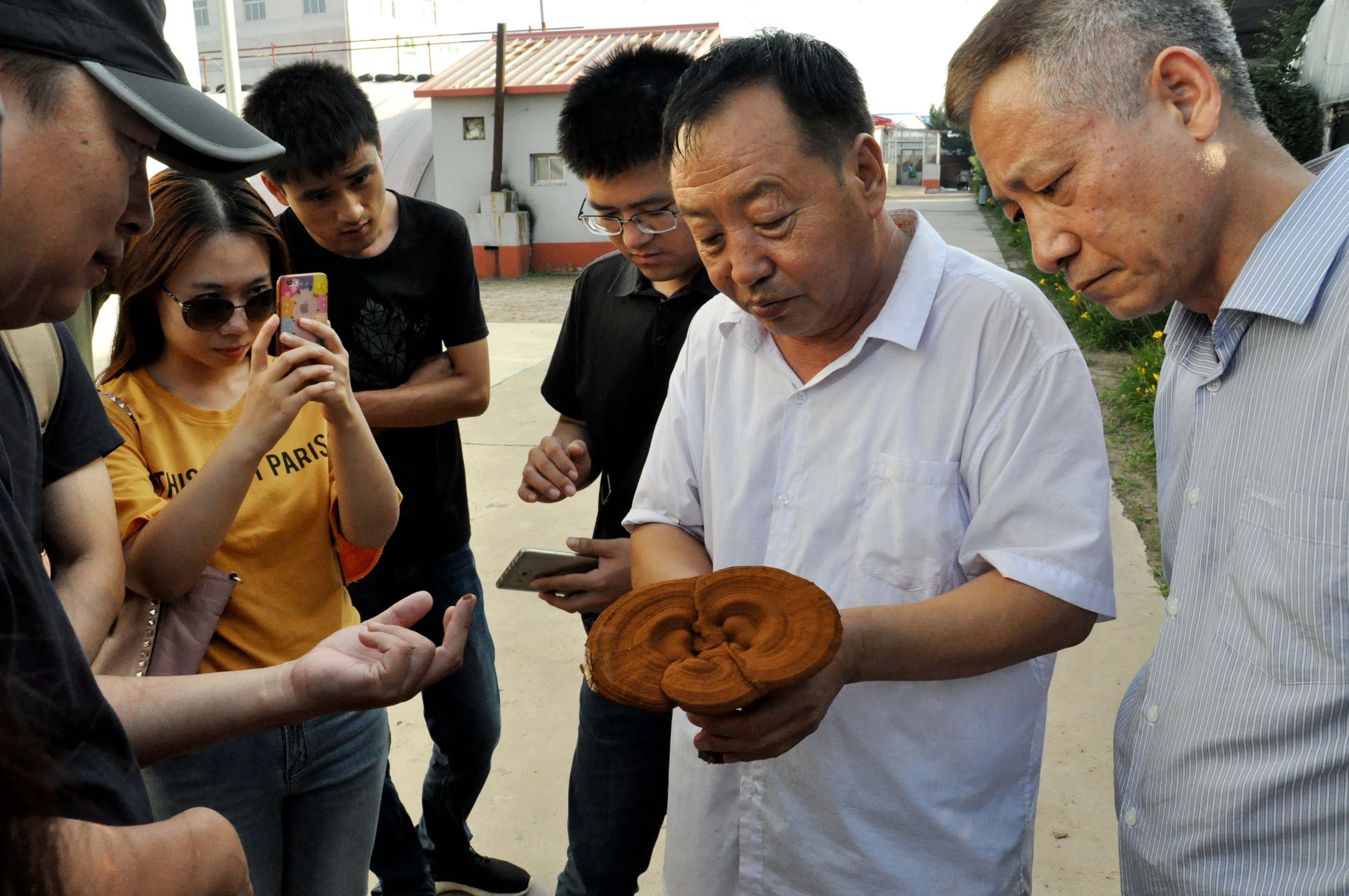 當地負責人向記者們介紹養殖的靈芝情況 朱胤元 攝
