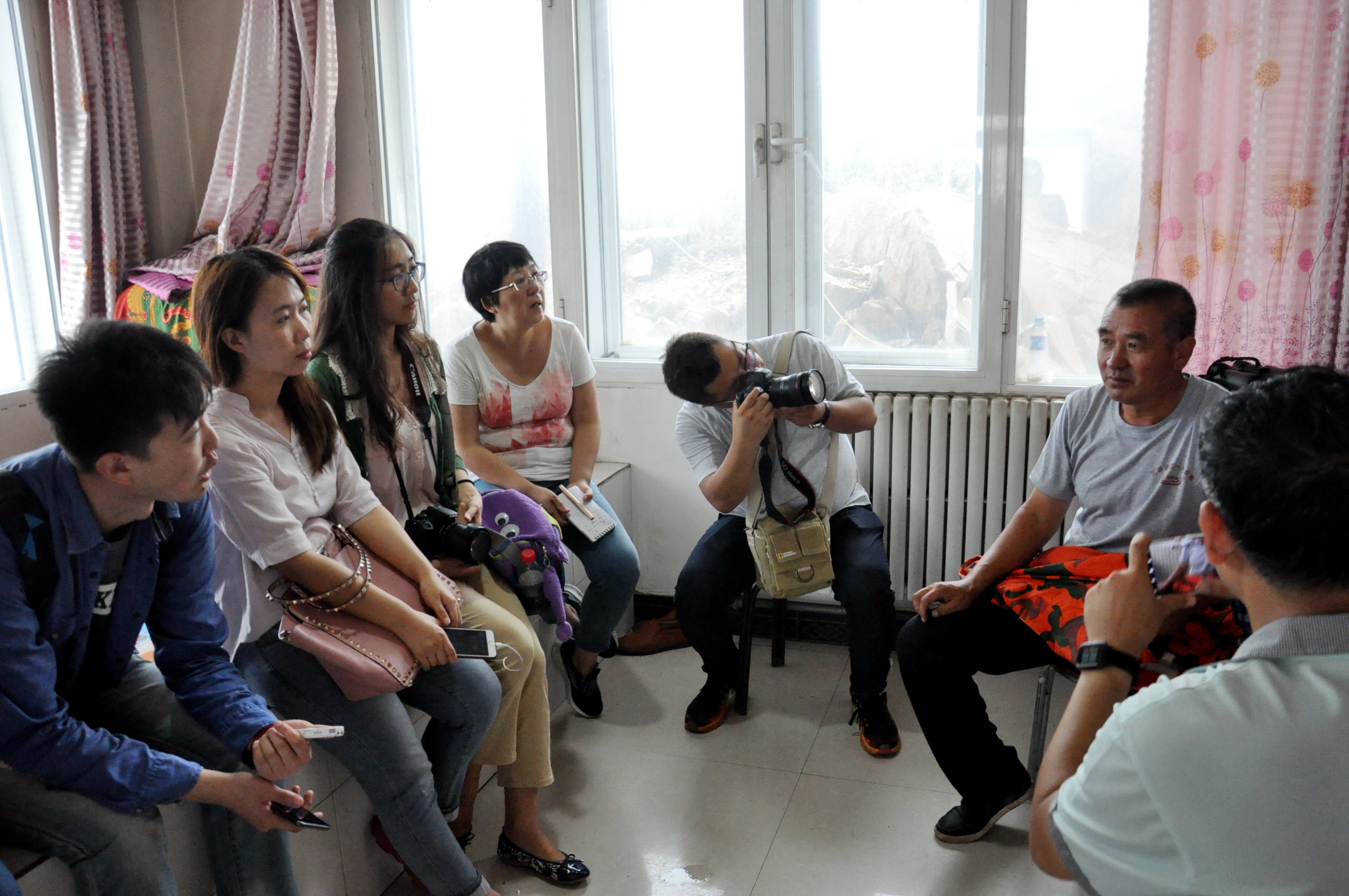 記者們在遼河源自然保護區大窩鋪林場護林員于輝合工作室兼臥室裏採訪 朱胤元 攝