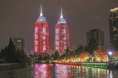 申城地標亮燈 祝福解放報慶