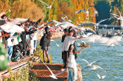 初冬時節,昆明海洪濕地公園內的水杉林逐漸披上“紅裝”,與滇池水面上成群翱翔的紅嘴鷗相映成趣,吸引了眾多游客前來觀鷗、賞景。
