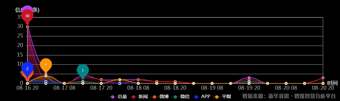截至目前,該文章在互聯網上傳播時長為4天5小時35分鐘,傳播總量109篇,有74個媒體參與傳播。其中2020-08-17 09時是傳播的高峰期,共傳播30篇文章。(數據來源:新華睿思•數媒智慧分析平台)